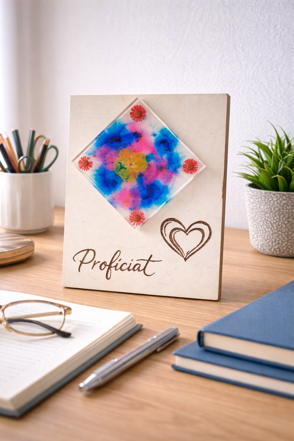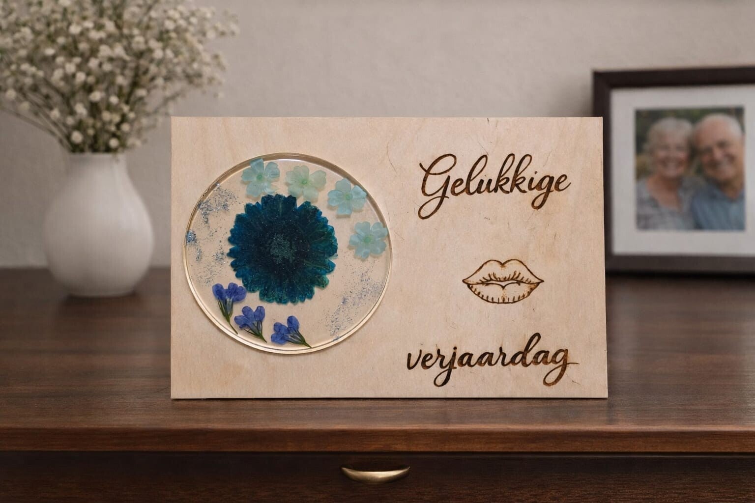 De combinatie van hout en epoxy zorgt voor een warme en speelse uitstraling. De kleurrijke bloemen brengen leven en vrolijkheid, terwijl de gegraveerde boodschap een duidelijke en persoonlijke touch geeft.